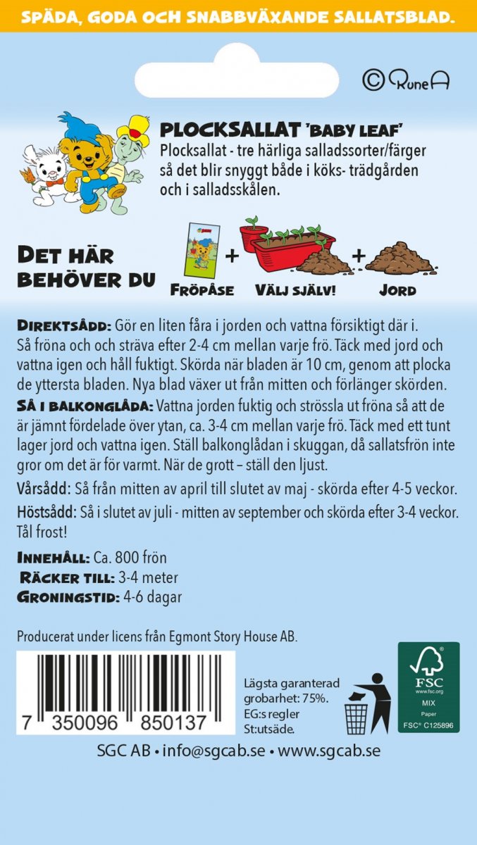 Direktsådd: Gör en liten fåra i jorden och vattna försiktigt där i. Så fröna och och sträva efter 2-4 cm mellan varje frö. Täck med jord och vattna igen och håll fuktigt. Skörda när bladen är 10 cm, genom att plocka de yttersta bladen. Nya blad växer ut från mitten och förlänger skörden.