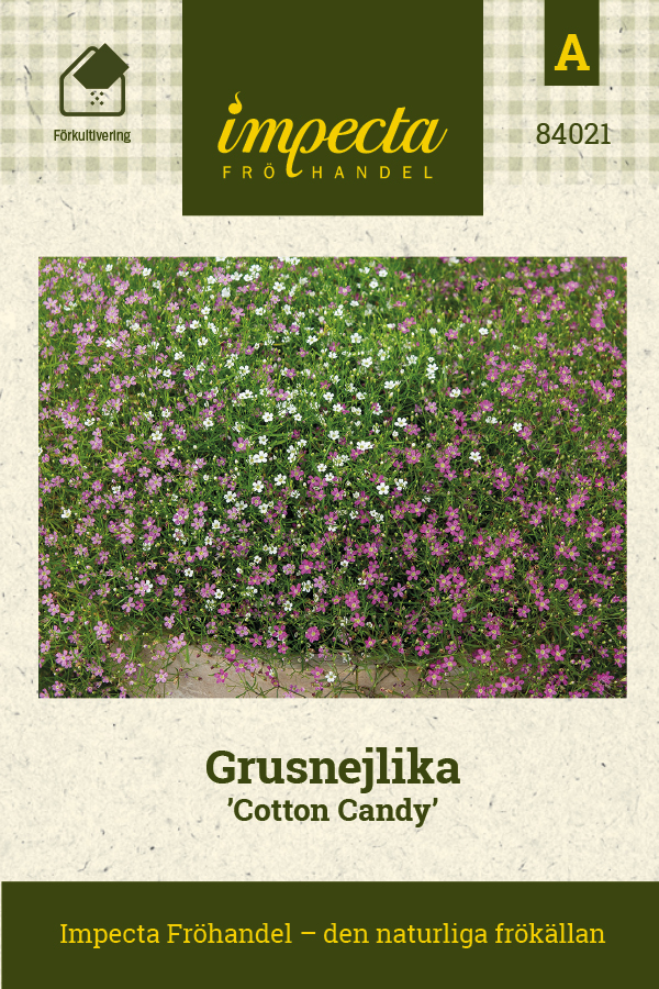 Grusnejlika ’Cotton Candy’ är en ljuvlig sommarblomma som får mängder av små fransiga blommor i vitt, babyrosa och mörkrosa. Blommorna sitter tätt och ger ett mjukt uttryck. Sorten blommar rikligt och håller igång hela säsongen tills kylan kommer.