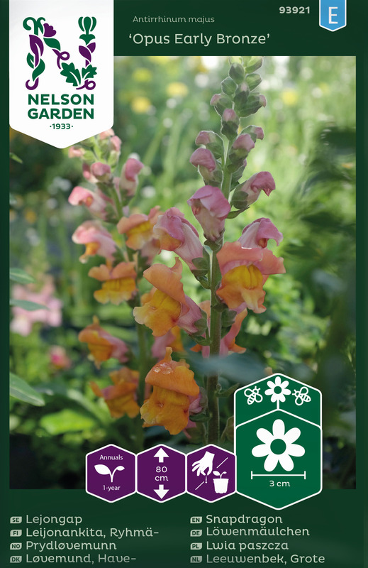 Lejongap 'Opus Early Bronze' (Antirrhinum majus 'Opus Early Bronze') är en imponerande sort med fylliga, krusiga blommor i nyanser av orange, brons och bränd rosa. Denna eleganta sommarblomma blir cirka 80 cm hög och är lika fantastisk i rabatter som i snittbuketter.