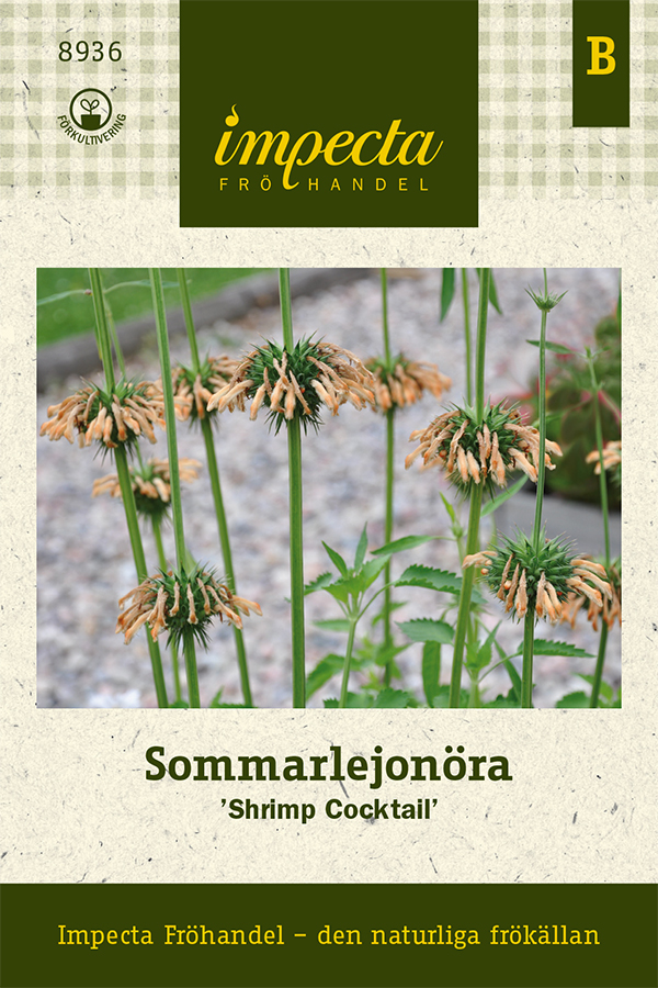 Kattmyntelöwe 'Shrimp Cocktail' (Leonotis nepetifolia 'Shrimp Cocktail') är en praktfull växt med ljust laxaprikosa, mjukt ludna blommor som sitter i kransar i flera etage längs stjälkarna. Med sitt ståtliga växtsätt är den en utmärkt centrum- eller bakgrundsväxt i rabatter. De dekorativa fröhusen är också perfekta för att skapa unika och hållbara arrangemang i buketter.