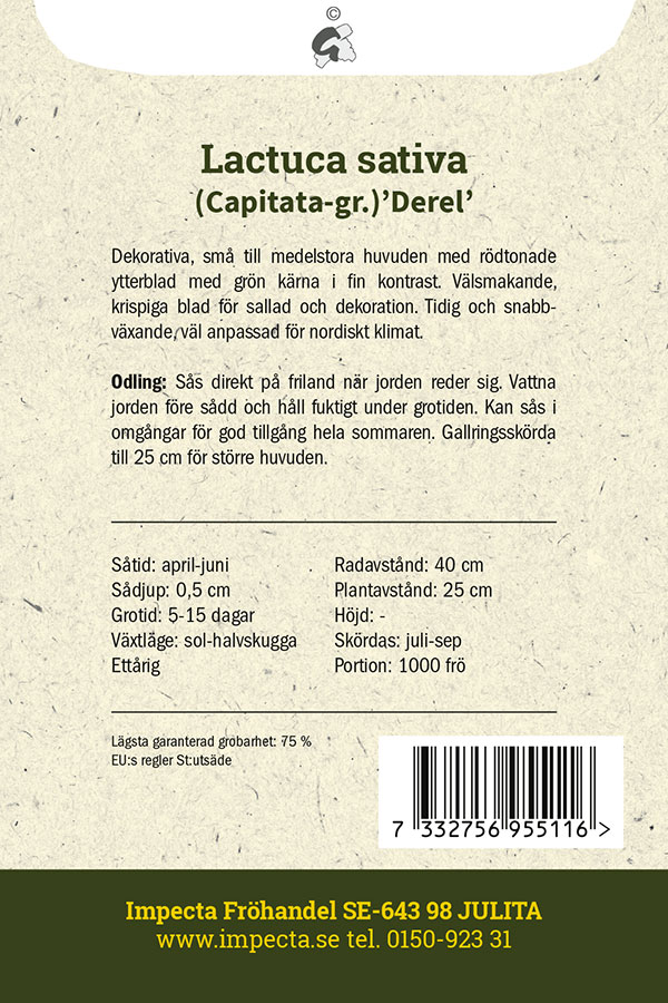 Produktbeskrivning:Små till medelstora huvuden med rödtonade ytterblad mot en grön kärna. Tidig och snabbväxande sort med välsmakande, vackra blad. Perfekt för odling i nordiskt klimat.