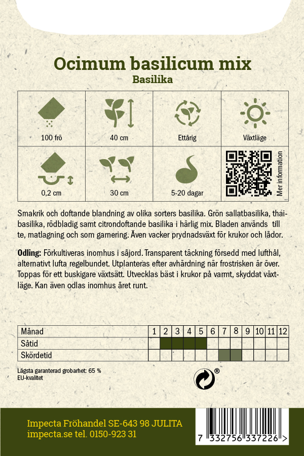 Basilika Mix är en smakrik och doftande blandning av flera olika sorters basilika. Här samsas grön salladsbasilika, thaibasilika, rödbladig basilika och citrondoftande basilika i en härlig kombination som ger både variation i smak och vackra nyanser i odlingen. Bladen passar utmärkt i matlagning, till te och som dekorativ garnering – och plantorna blir dessutom fina prydnadsväxter i krukor och lådor.