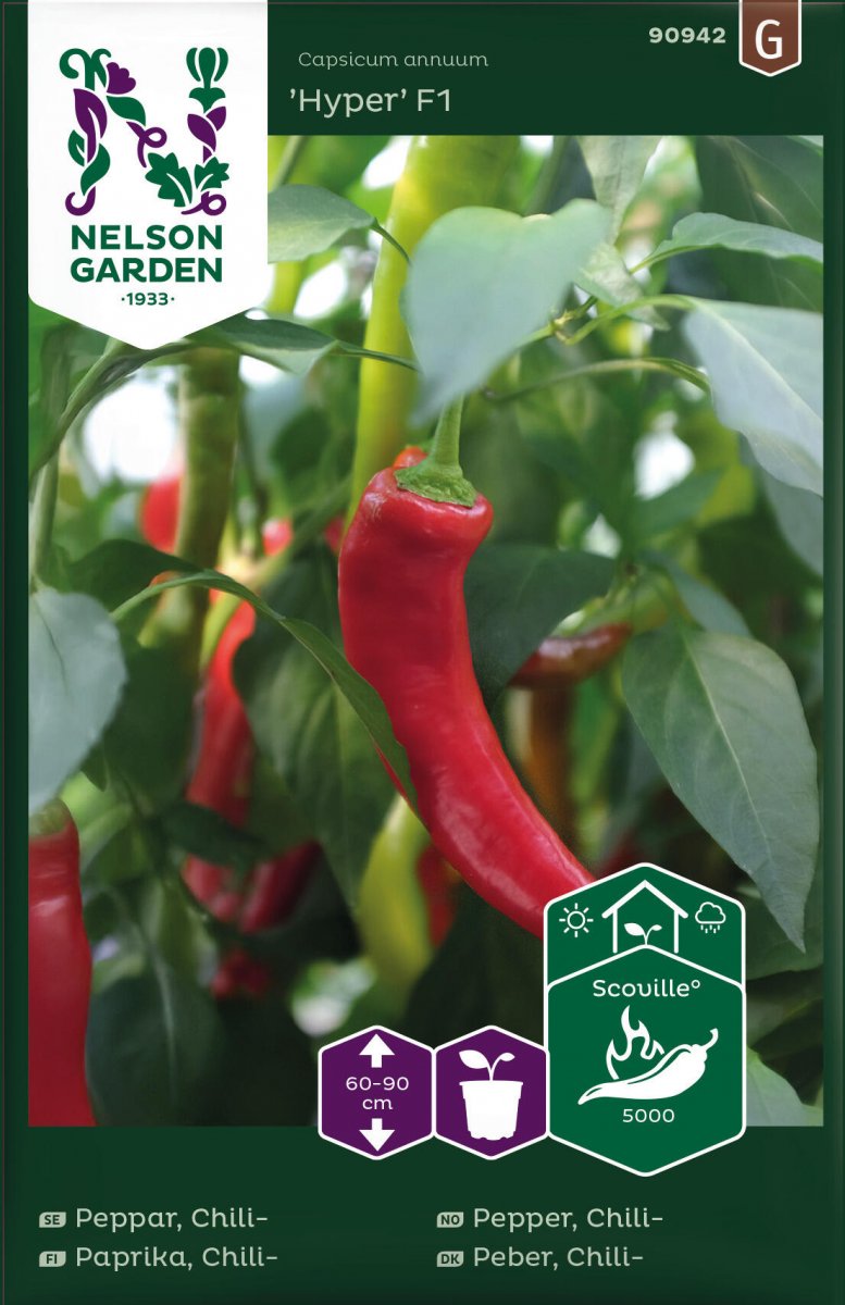Hyper F1 En tidig chilisort som är robust och resistent. Höga stjälkar som gör frukten lättplockad. De långa frukterna kan skördas antingen som gröna eller röda. Smaken är kryddig. Odla den i växthus eller i skyddat läge utomhus. Trivs i näringsrik och väldränerad jord. Vattna regelbundet.