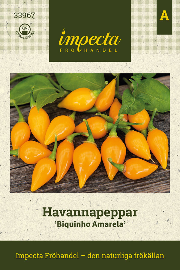 Produktbeskrivning:Chili 'Biquinho Amarela' (Capsicum chinense 'Biquinho Amarela') är en rikgivande sort med klargula, små droppformade frukter. De har en relativt mild smak med en tydlig citruskaraktär och en hetta på 500–1000 Scoville. Perfekt att använda färsk i sallader eller som en dekorativ och smakrik ingrediens i inläggningar. Ett unikt och aromatiskt tillskott till chiliträdgården!