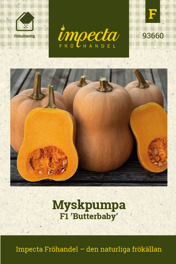 Pumpa ’Butterbaby’ är en lättodlad butternutsort som ger jämna frukter på cirka 1–2 kilo. Frukterna har ett slätt beigefärgat skal och ett djupt orange kött som är sött, aromatiskt och tätt i konsistensen, perfekt till soppor, gratänger, ugnsrostning och andra varma rätter.