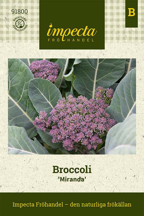 Broccoli 'Miranda' (Brassica oleracea 'Miranda') är en vacker och smakrik sort av calabresetyp med huvuden i en dekorativ lila nyans. Den spröda konsistensen och rika smaken gör den till ett utmärkt val för både färsk användning och matlagning. Efter huvudskörden bildar plantan många sidoskott, vilket ger en förlängd skördesäsong. 'Miranda' är också perfekt för infrysning, vilket gör den till en praktisk och hållbar gröda i köksträdgården. Ett dekorativt och delikat tillskott till odlingarna!
