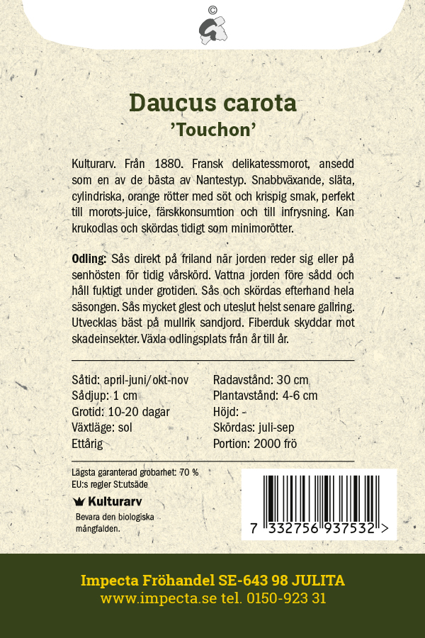 Sommarmorot 'Touchon' (Daucus carota 'Touchon') är en snabbväxande kulturarvssort från 1880 som ger cylindriska, orange rötter. Dessa delikatessmorötter har en söt och krispig smak, vilket gör dem perfekta för färsk konsumtion, sallader och matlagning. 'Touchon' kan skördas tidigt som minimorötter eller låtas växa till full storlek. Ett utmärkt val för köksträdgården, där den kombinerar smak, kvalitet och historia!