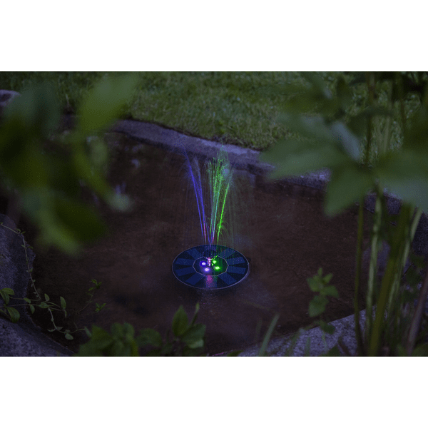 Fontänen laddas av solpanelen som driver pumpen och laddar det medföljande batteriet. När solen skiner börjar vattnet porla, och när mörkret faller lyser fontänen upp med färgskiftande LED-lampor som skapar en stämningsfull effekt i trädgården.