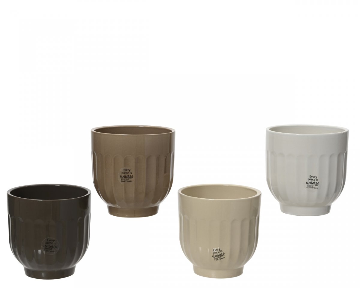 En dekorativ kruka i keramik med subtil rilletur och elegant, rund form. Den glaserade ytan i jordnära färger – som brun, beige, ljusbrun och vit – ger en naturlig och ombonad känsla i inredningen.