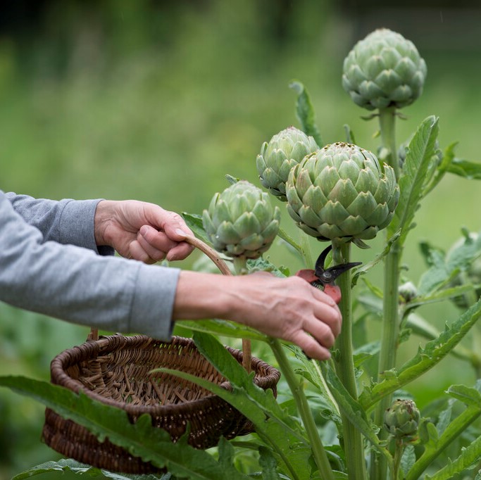 Skörda när dom yttersta fjällen börjar att separera från varandra och kronärtskockan ser fyllig ut. Ta med en bit av stjälken för lättare hantering.