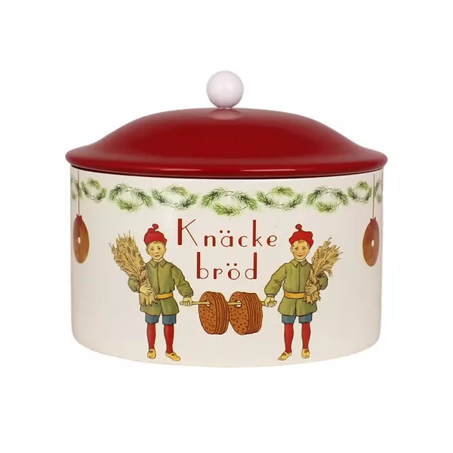 Stor plåtburk med nostalgiskt julmotiv för knäckebröd. Lock i rött med en rund knopp. Silikonring som gör att locket sitter stadigt och sluter tätt. Praktisk förvaring och fin att ställa fram på julbordet.