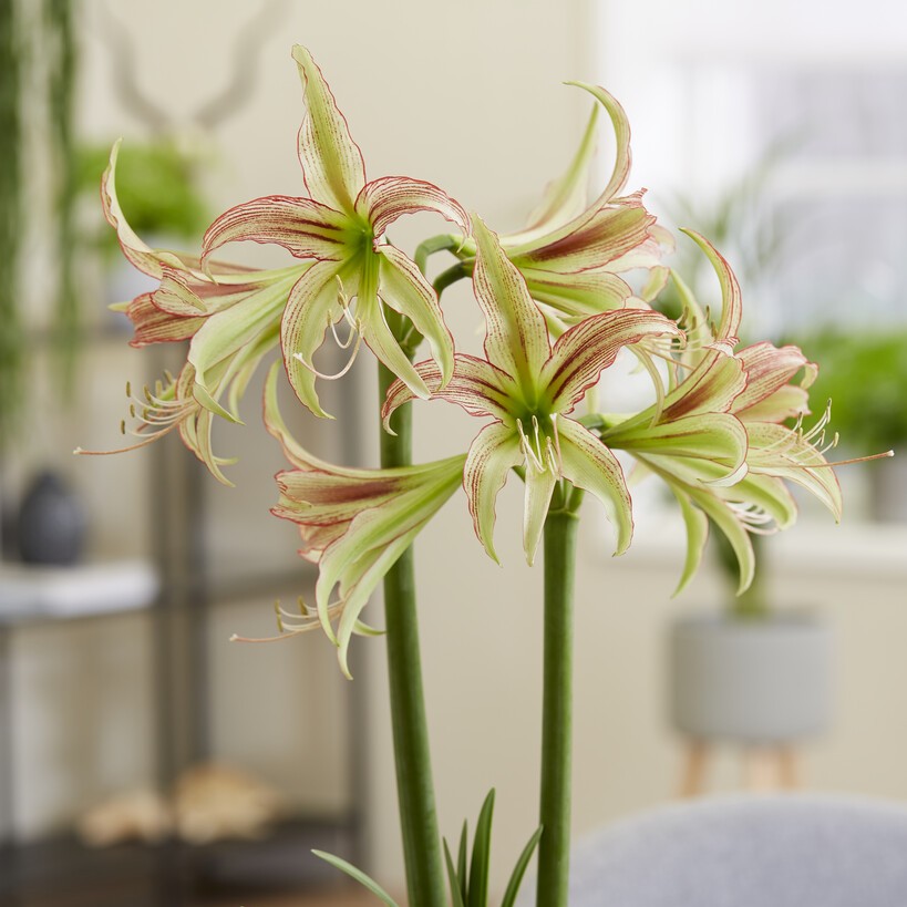 Hippeastrum 'Emerald'® är en fjärilsamaryllis med smala, ljusgröna kronblad, prydda med subtila röda strimmor och en grönaktig mitt. Blommorna är eleganta och exotiska med en diameter på upp till 10 cm. Den blir cirka 45–50 cm hög och blommar 6–10 veckor efter plantering. 'Emerald'® passar perfekt som inomhusväxt under vintern och trivs bäst i ljust, varmt läge. Dess långlivade blommor gör den också fin som snittblomma.