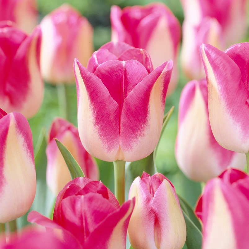 Ceriserosa tulpan med vit bred rand i mitten på kronbladen.
