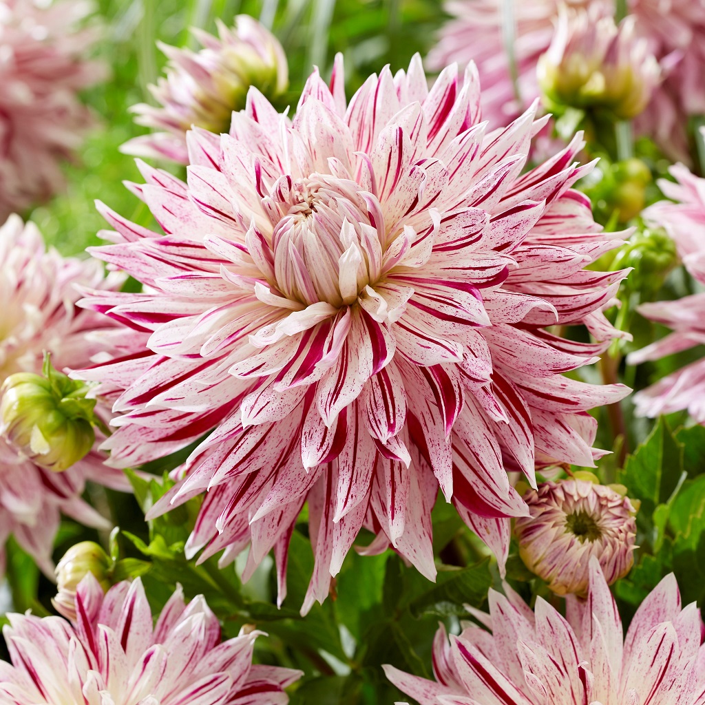 En vacker kaktusdahlia som är vit till färgen med purpurfärgade strimmor. Passar såväl till rabatten som urna och går bra att använda som snittblomma.