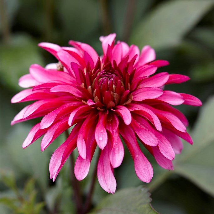 Ceriserosa kronblad med mörkare undersida och kronbladen kan vara lite skruvade i toppen. Bladverket är mörkgrönt.