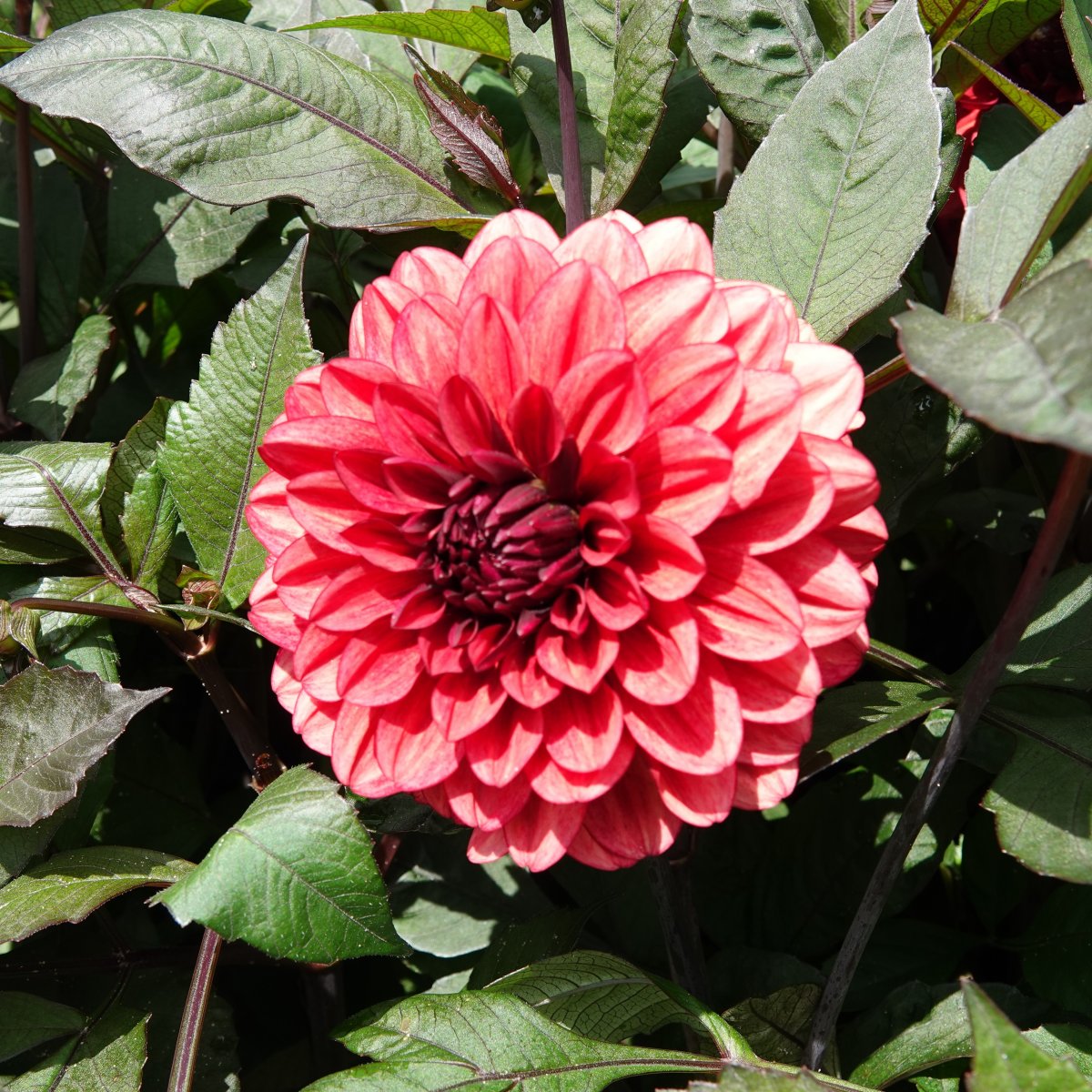 Dahlia ’Orient Express’ – korallröd dekorativ dahlia med mörkgrönt bladverk