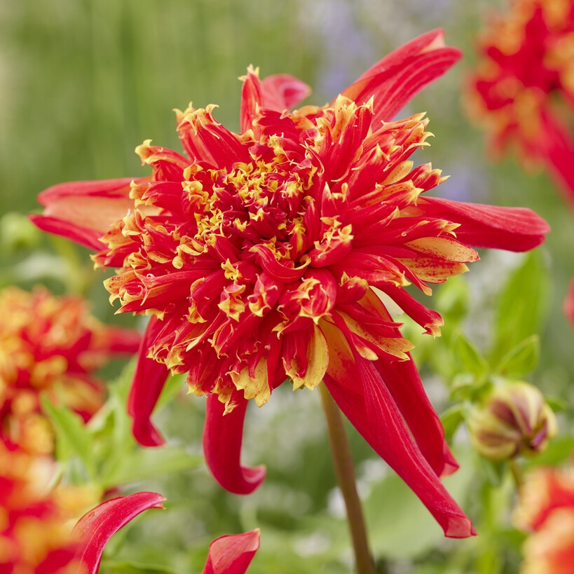 Dahlia ‘Octopus Sparkle’ – tvåfärgad röd och gul dahlia för rabatt och snitt