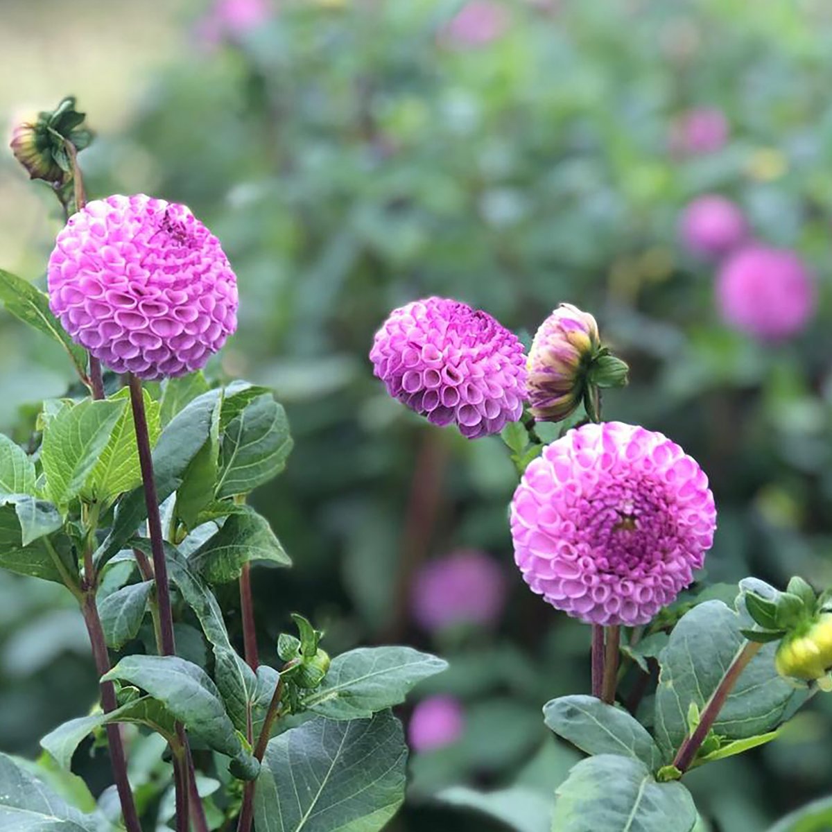 Dahlia ‘Frank Holmes’ är en charmig pompondahlia med perfekt formade, små bollar i skiftande lila toner som ger liv och djup åt både rabatt och bukett. De tätt fyllda blommorna, cirka 5–7 cm i diameter, sitter på stadiga stjälkar och plantan är stabil och tät med en höjd på omkring 80 cm. Den kompakta växtformen gör ‘Frank Holmes’ lätt att placera i trädgården och idealisk som snittblomma. Med sin långa blomning från högsommar till sen höst och sina mjuka, varierande färgnyanser är den ett elegant och pålitligt inslag i varje plantering.