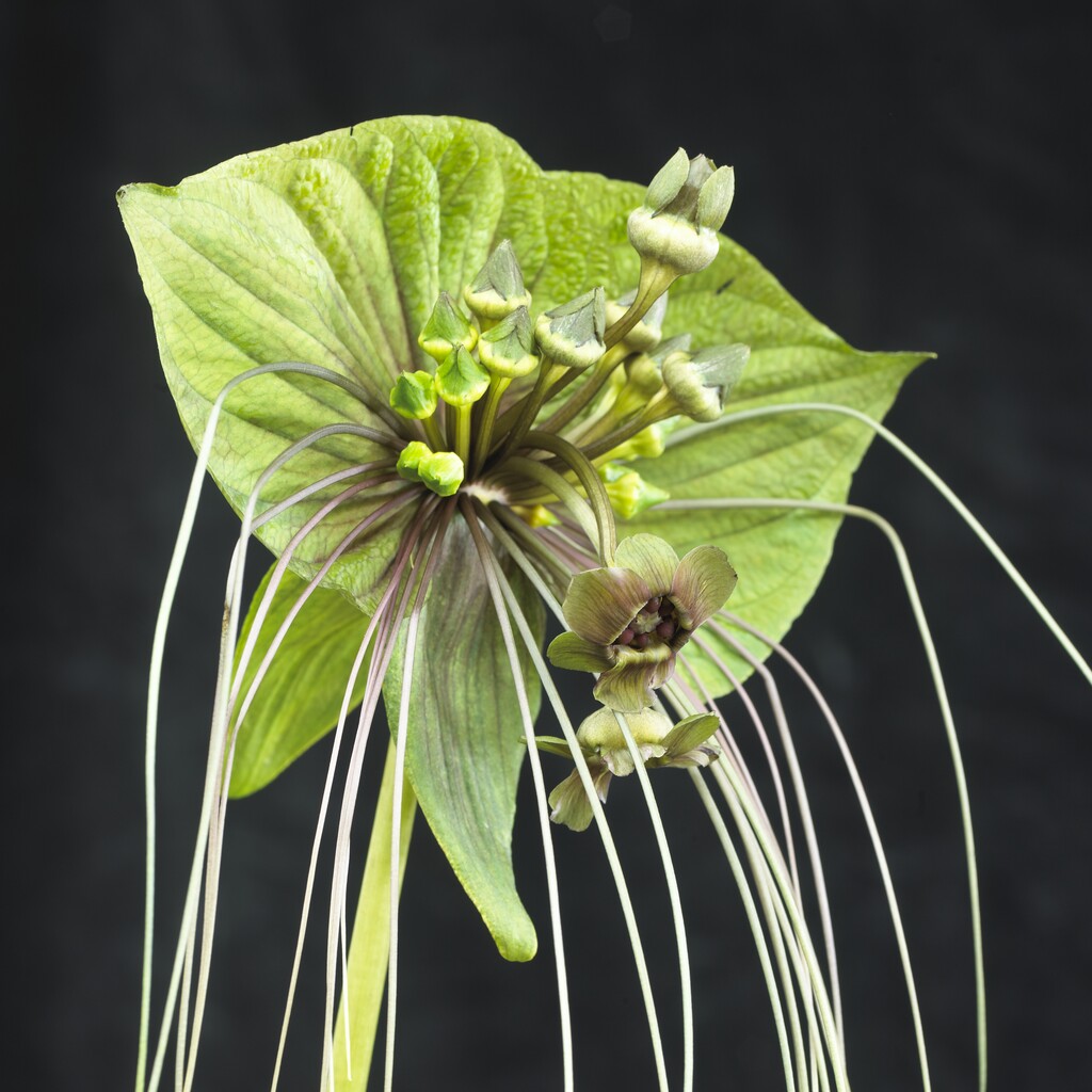 Gröna blommor som påminner om en fladdermus, därför kallas den även för fladdermusblomma.