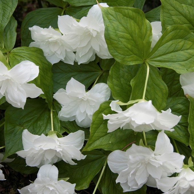 Trillium grandiflorum får en vit, fylld blomma på toppen av stammen. Växten är ej flerårig i hela Sverige.