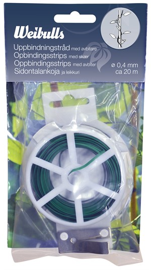 Följsam överdragen metalltråd på rulle med smart avbitare. Lämplig för uppbindning av växter, påsförslutning m.m.