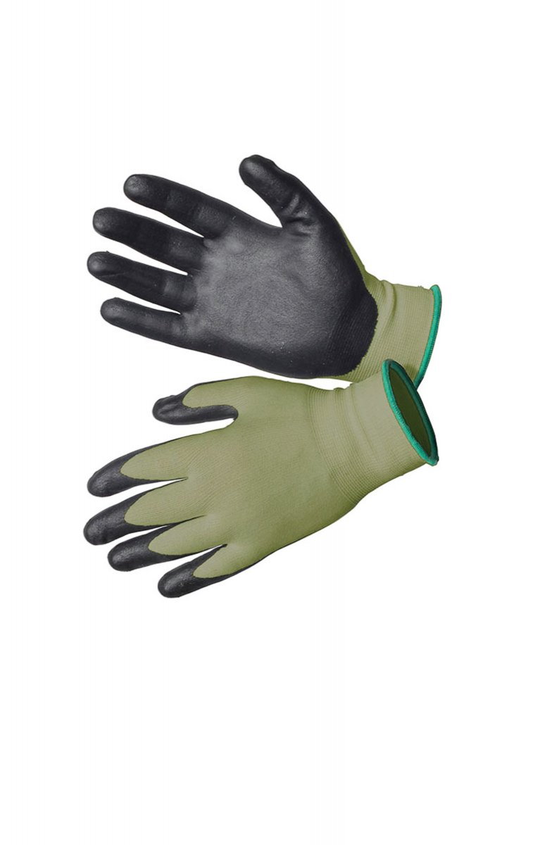 Tätstickad handske av återvunnen polyester (vattenflaskor) och spandex, med nitrildoppning i innerhand och på fingertoppar. En mycket smidig handske med ett bra grepp.