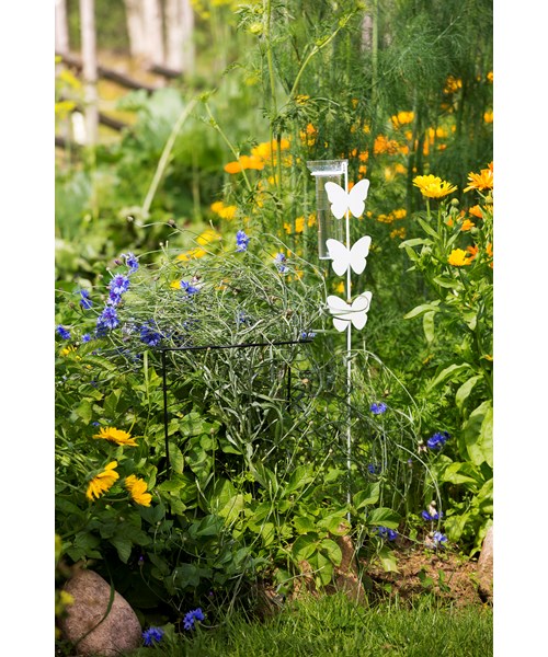 Somrig regnmätare med tre fjärillar och transparant plast glas. Glaset är lätt avläst med en markering mellan 0-40mm Placera regnmätaren så rakt och stadigt om möjligt, gärna på en öppen plats i trädgården. För bästa mätningsresultat brukar man läsa av vid ungefär samma tidpunkt varje dag och och tömas efter mätning.