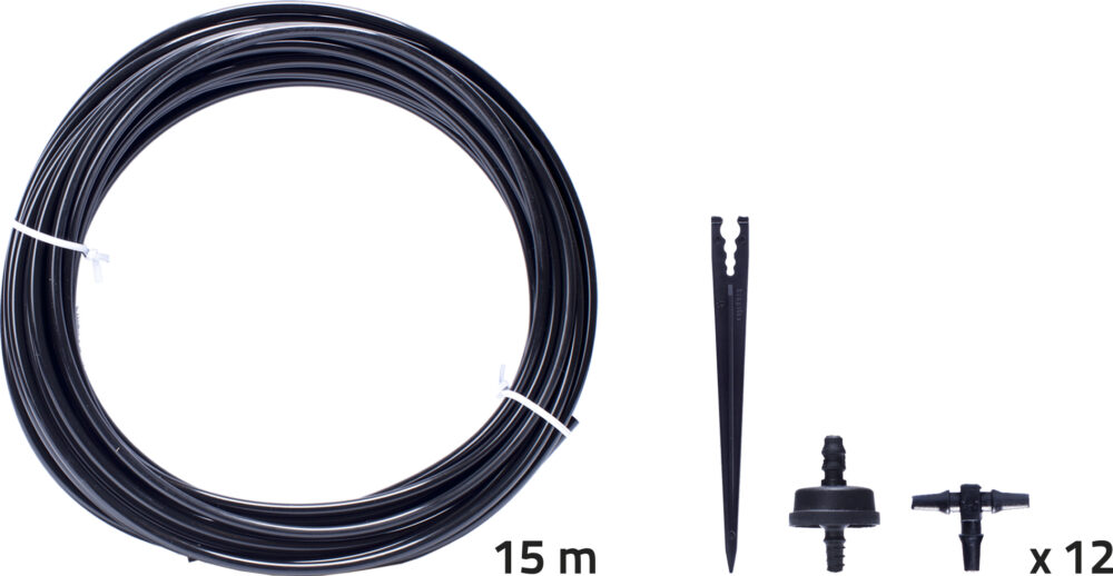 Innehåll: 12 droppmunstycken, 12 slanghållare, 12 T-kopplingar, 15 m slang