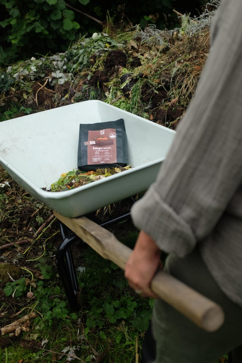 Blanda Improve Kompostaktivator med ditt komposterbara material, eller lös upp i vatten och vattna över din kompost.