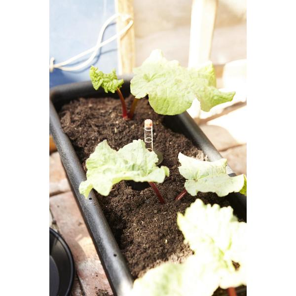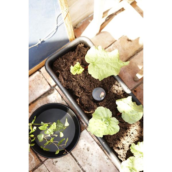 Rymlig och rustik balkonglåda med långtidsbevattning och extra stort vatten- och jordmagasin, 7,5 L resp 25 L. Överfyllnadsskydd i lådan förhindrar att växternas rötter blir stående i vatten. Tydlig mätsticka visar när det är dags att fylla på vatten - ingen risk för övervattning. Tillverkad av återvunnen plast.