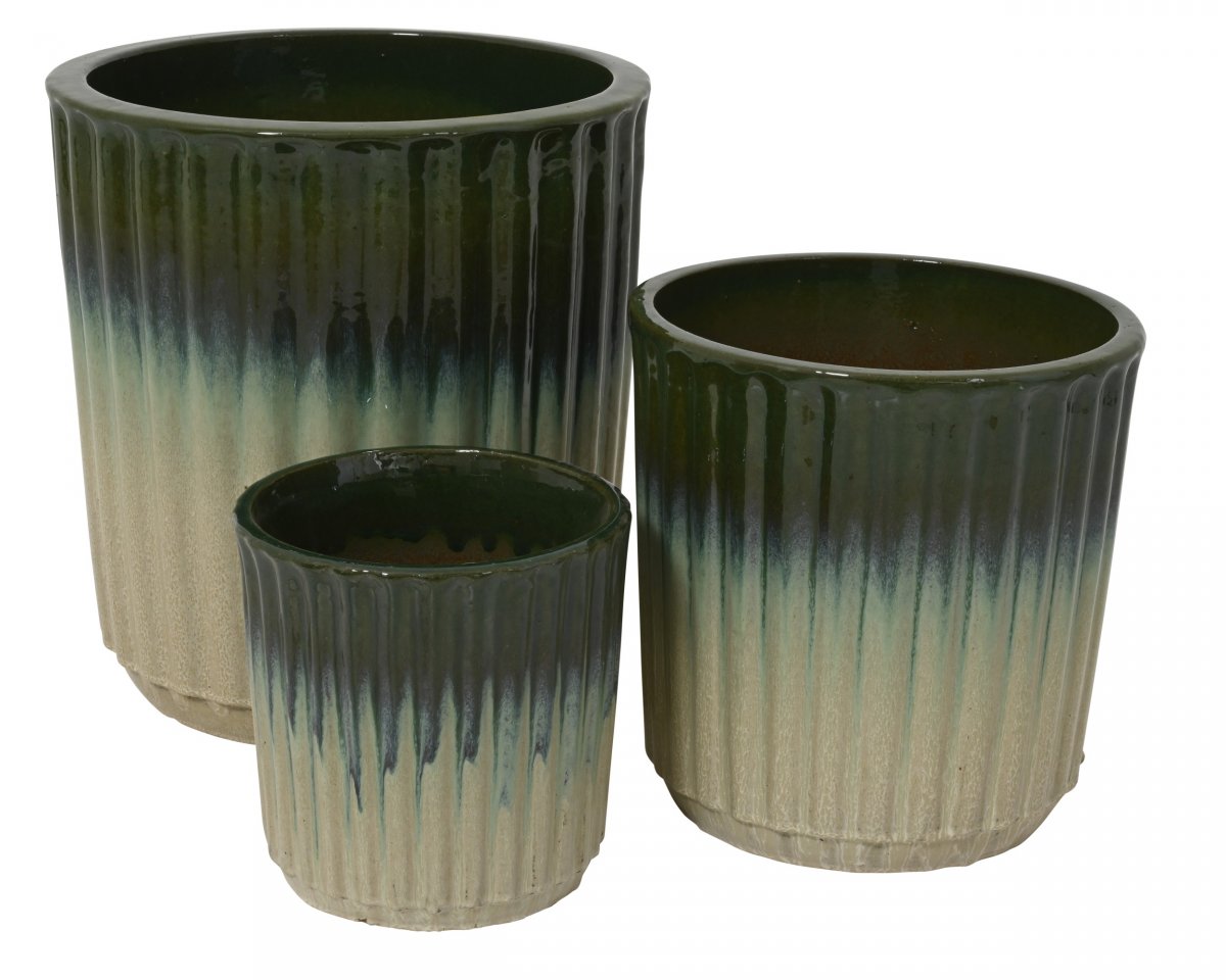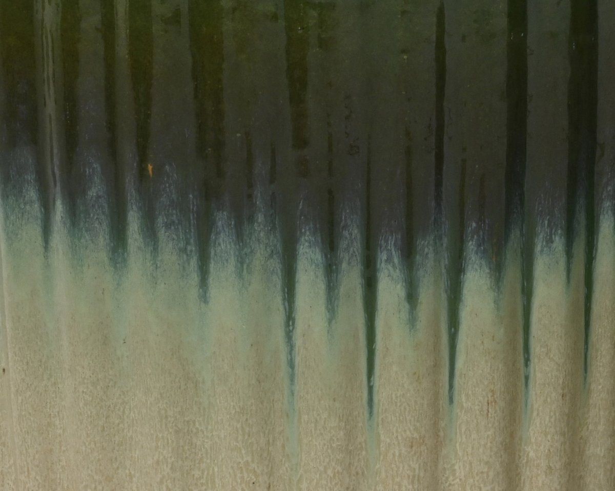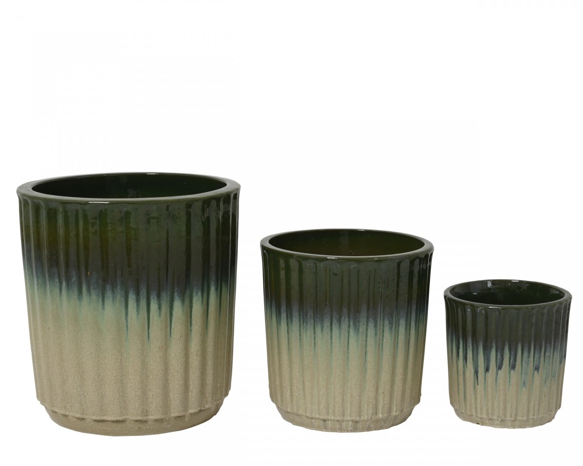 Stilfull kruka med vackert rinnande glasyr i djup grön ton som mjukt övergår i beige. Den lodräta strukturen tillsammans med den levande glasyren ger varje kruka ett unikt uttryck.