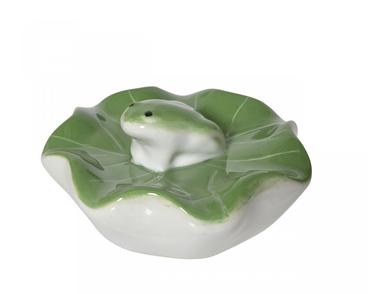 En charmig och dekorativ figur föreställande en groda sittande på ett blad, tillverkad i keramik med blank glasyr i gröna och vita toner. Denna naturinspirerade prydnad ger en lekfull men elegant accent till din trädgård, balkong, veranda eller som en detalj inne i hemmet.