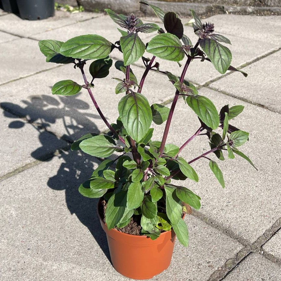 Blomsterbasilika är precis som namnet antyder – dess små, ametistfärgade blommor och auberginefärgade foderblad som i mängd ger ett slående intryck, hamnar i rampljuset.. Bladen, som harmoniskt går ton-i-ton med blommorna, får en något mer underordnad roll. Detta är sommarens största insektsmagnet – alltid fylld av liv.