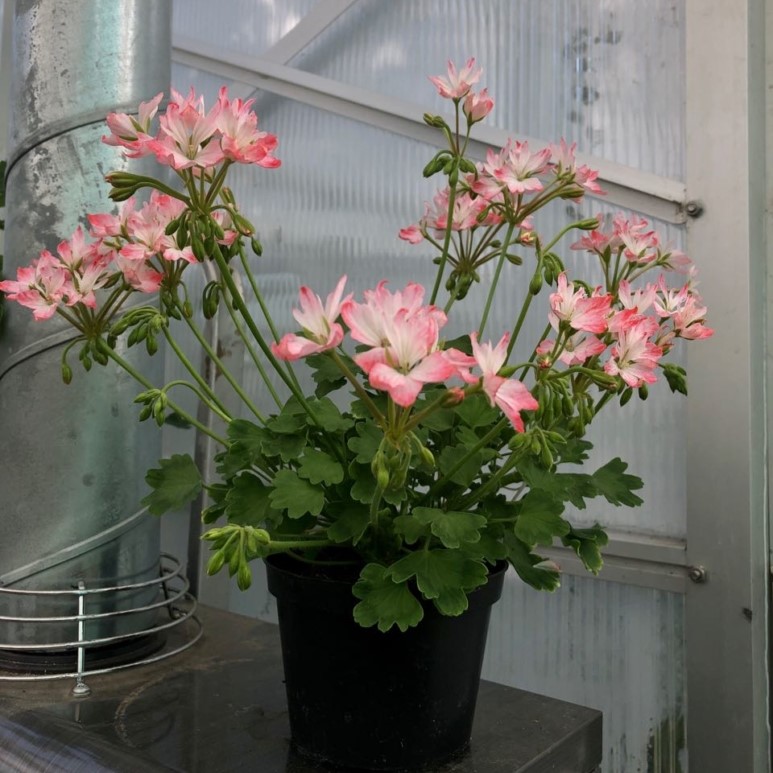 Dvärgpelargon ’Nisse’ är en snygg och mycket dekorativ sort med enkla, vita blommor som har en skarp ceriserosa kant. Den tydliga färgkontrasten ger blommorna ett friskt och grafiskt uttryck som gör sorten extra iögonfallande.