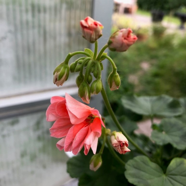 Dvärgpelargon ’Minah’s Cascade’ är en otroligt vacker sort med dubbla, laxrosa blommor som ger ett mjukt och elegant uttryck. Blommorna sitter tätt och framhävs fint av det gröna bladverket.