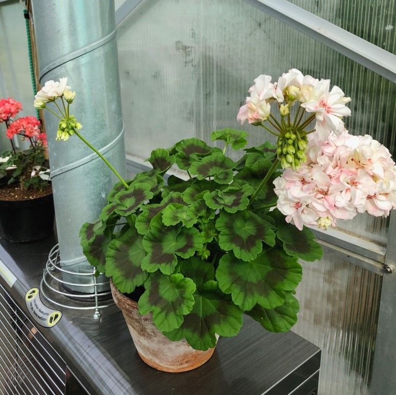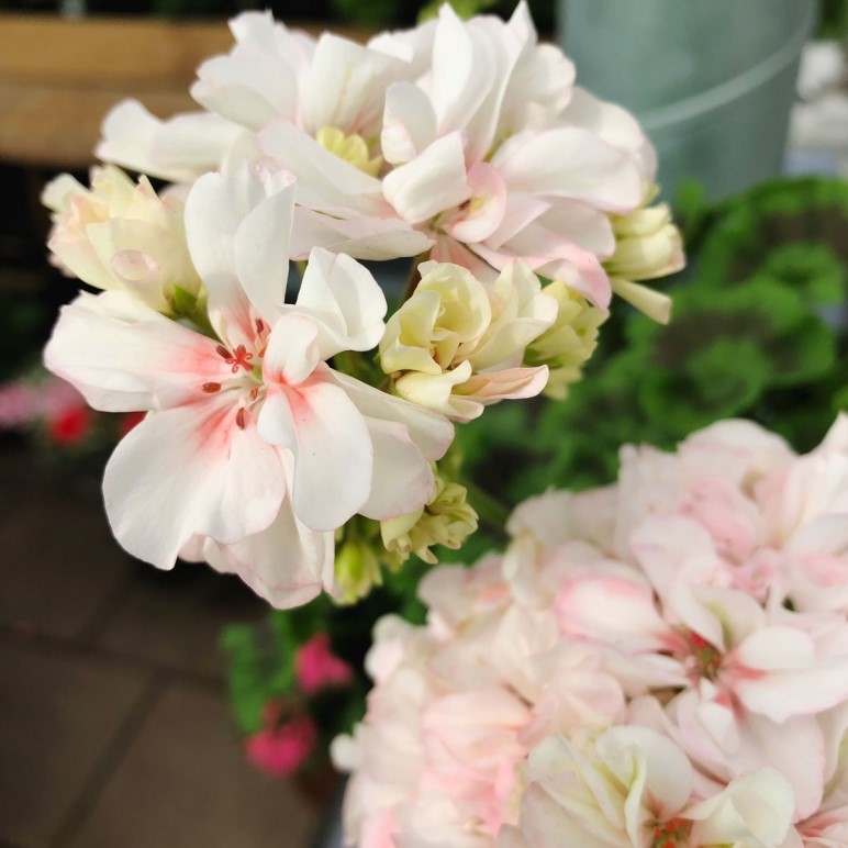 Dvärgpelargon ’Potter Heigham’ är en ljuvlig och mycket dekorativ sort med dubbla, nästan vita blommor som har mjuka rosa schatteringar och en något mörkare rosa mitt. Blommorna ger ett elegant och romantiskt uttryck och står vackert mot det gröna bladverket med en tydlig mörk markering.
