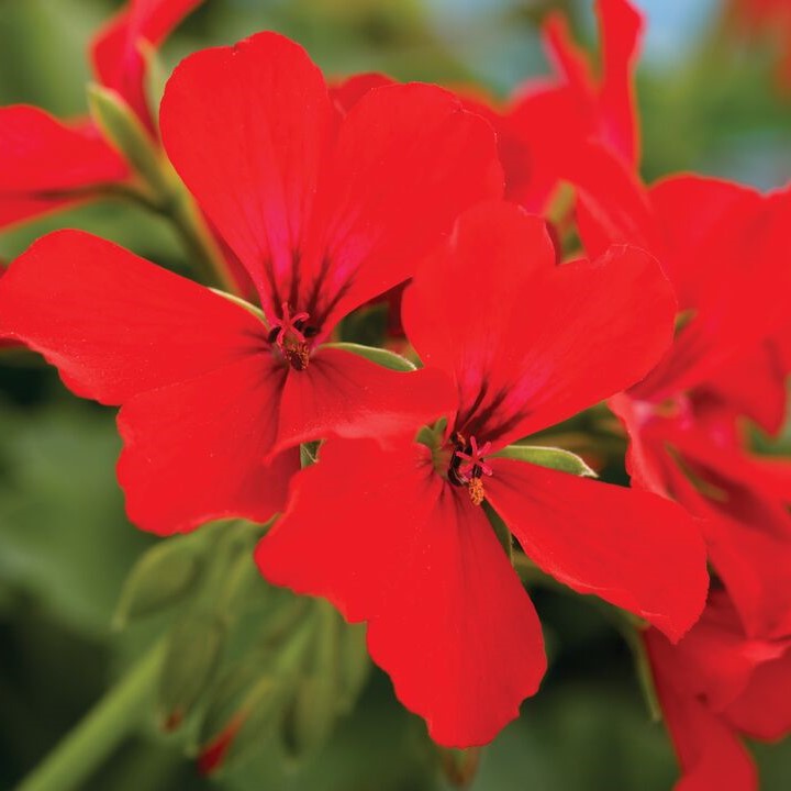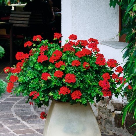 En härlig pelargon som blommar rikligt i en vacker röd färg. Bladverket är grönt.