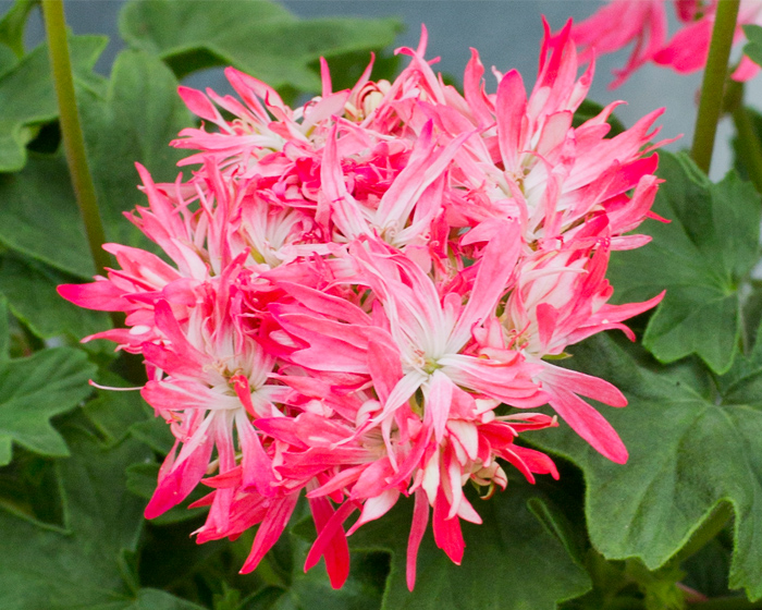 Vilken härlig pelargon! Korallrosa blommor med vita inslag bjuds det på här! Miniatyrpelargoner bör planteras i små krukor.