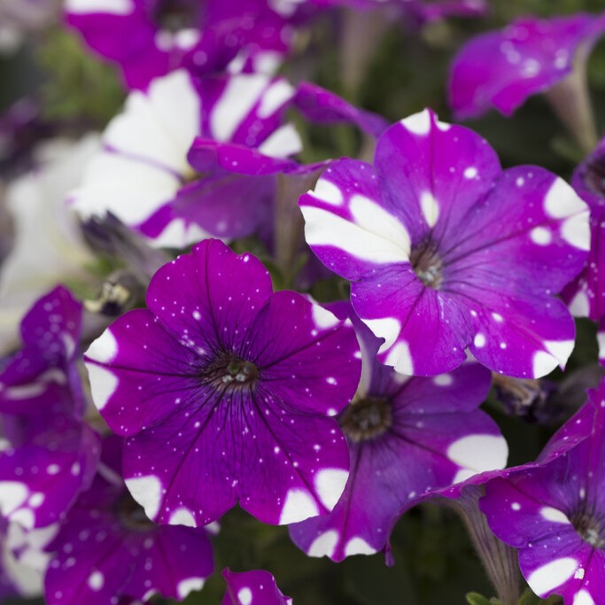 Denna petunia är verkligen vacker med sina enkla blommor i lila med vita prickar.