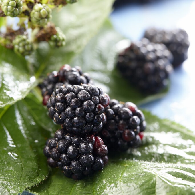 svart stor till mycket stor, saftig och fast, söt smak, mognar juli-aug, tagglös, 1,5-2m, sol, zon 1-4 (5).