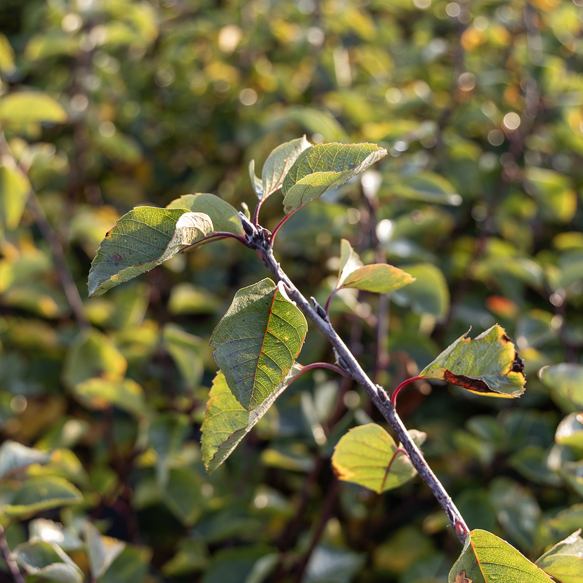 vit, doft, april-maj, 1,6cm stora blåsvarta ätliga bär i juni-juli, saftig söt smak, guldgul höstfärg, 2,5-4m, sol, halvskugga, zon 1-7.