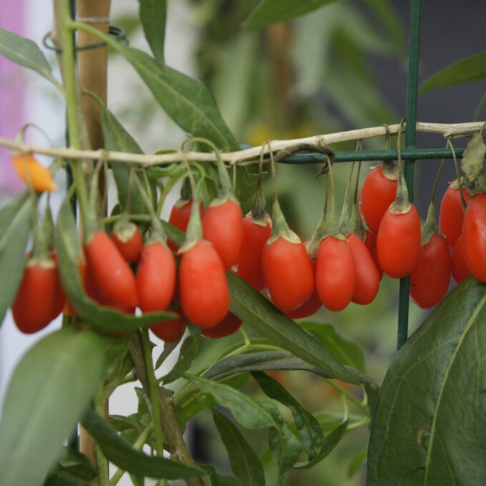 orangeröd 2-2,5cm stor, söt smak, mognar aug-okt, lila blo i juni-juli, 1,5-2,5m, sol, halvskugga, zon 1-5.