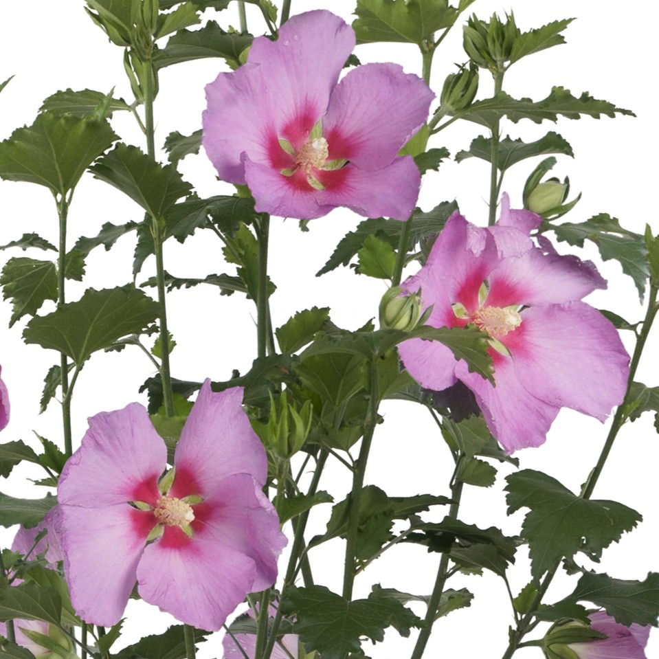Frilandshibiskus (Hibiscus syriacus 'Big Hibiskiss'®) är en iögonfallande prydnadsbuske som imponerar med sina stora, spektakulära blommor. Blommorna är djupt rosa med en intensiv röd mitt som skapar en dramatisk kontrast och förhöjer växtens exotiska utseende. De breda, trattformade blommorna kan bli upp till 10–12 cm i diameter och pryder busken från sensommaren till långt in på hösten, vilket ger en långvarig blomprakt när många andra växter börjar tappa sin färg.