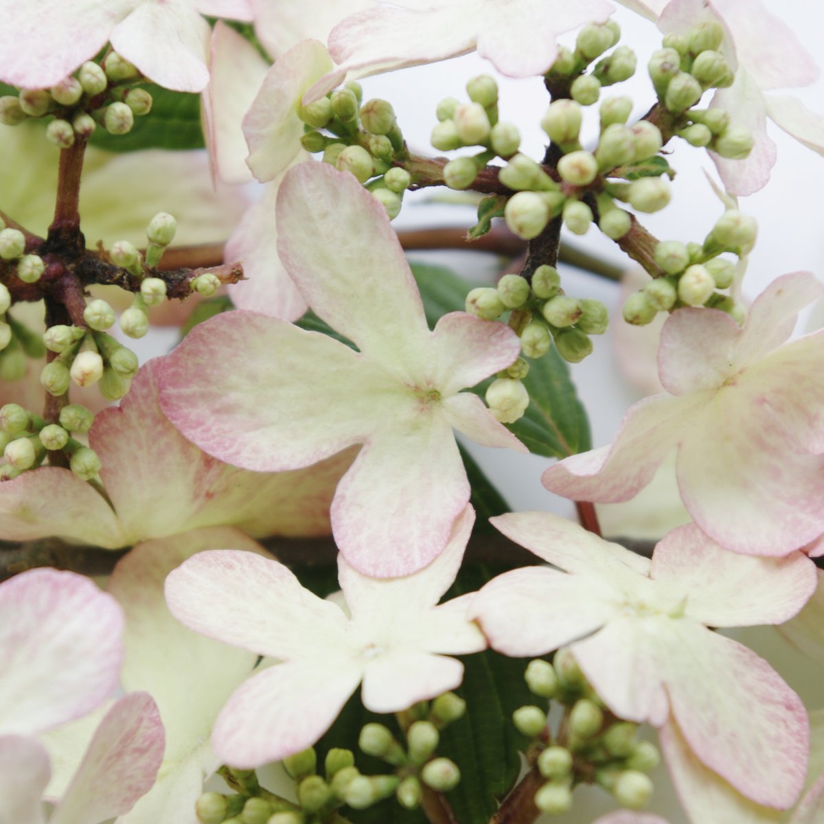 vita som övergår till rosa platta blo, juni-juli, rosaröda bär hösten, 1,5-2,5m, röd höstfärg, sol, halvskugga, zon 1-3.