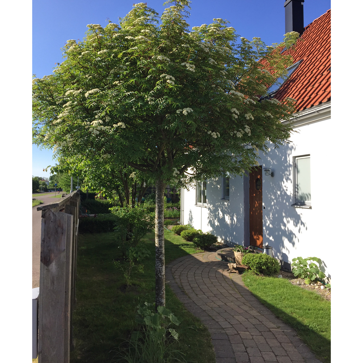 Sorbus commixta 'Carmencita', japansk rönn, är ett litet till medelstort lövfällande träd inom familjen Rosaceae. Bladen är parbladiga, mörkgröna och blanka med spetsiga småblad som skiftar i strålande orange och röda nyanser på hösten. Under våren, i maj och juni, blommar 'Carmencita' med små vita blommor samlade i stora, yviga flockar. Blommorna är rika på nektar och lockar pollinatörer som bin och fjärilar. Mot sensommaren utvecklas mängder av små, klarröda och glänsande bär som sitter i täta klasar och ger trädet en extra dekorativ effekt långt in på hösten. De attraktiva frukterna uppskattas av fåglar och bidrar till trädgårdens biologiska mångfald.