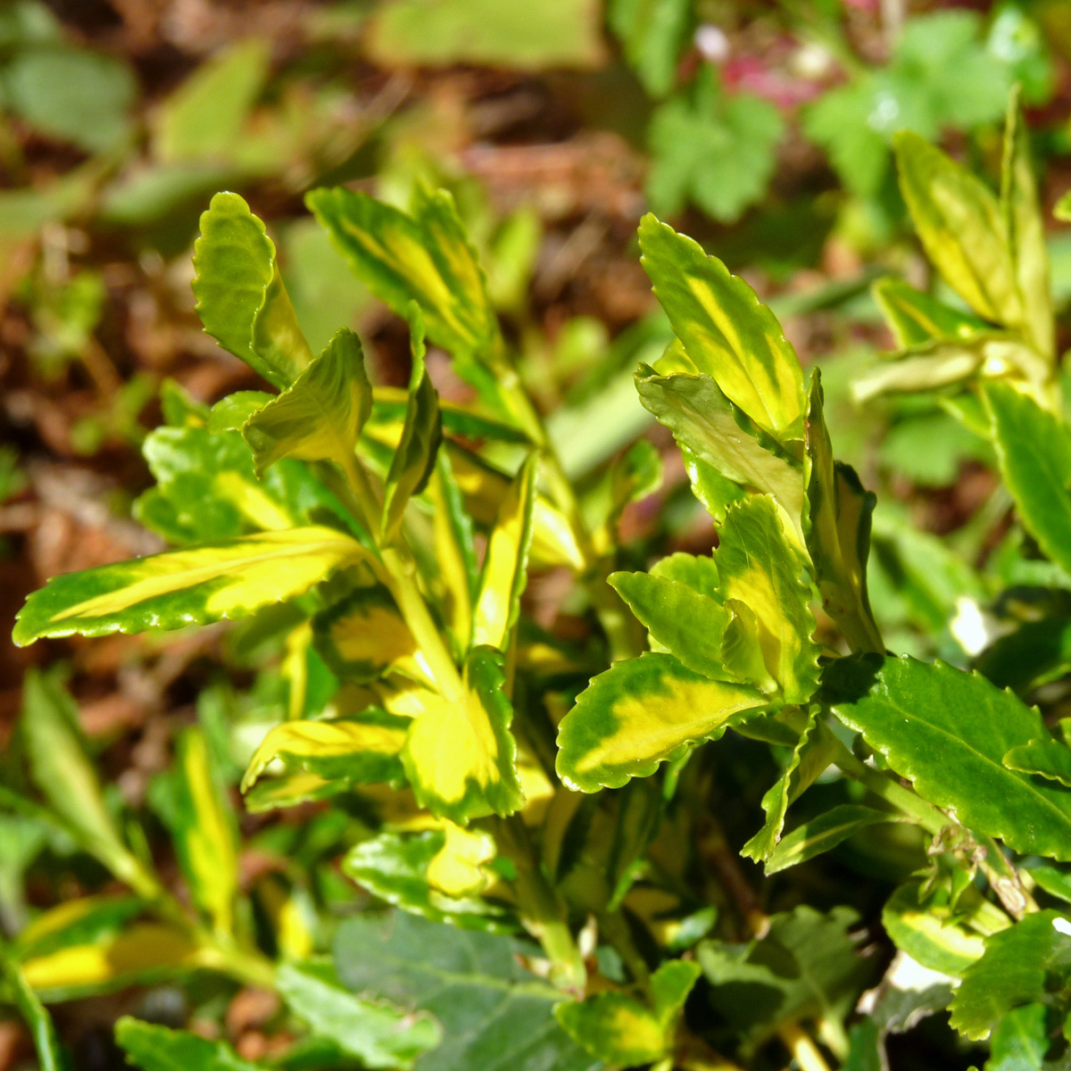 Klätterbenved 'Blondy' (Euonymus fortunei 'Blondy') är en kompakt, vintergrön buske som imponerar med sitt dekorativa bladverk och mångsidiga användningsområden. Med ett lågt och mattbildande växtsätt når den en höjd på cirka 30–40 cm, vilket gör den idealisk som marktäckare, kantväxt eller för plantering i grupper. Bladen är ovala, blanka och har en intensivt gul mitt som kontrasterar vackert mot de mörkgröna kanterna. Denna färgprakt ger liv åt trädgården året om, även under de gråare vintermånaderna.