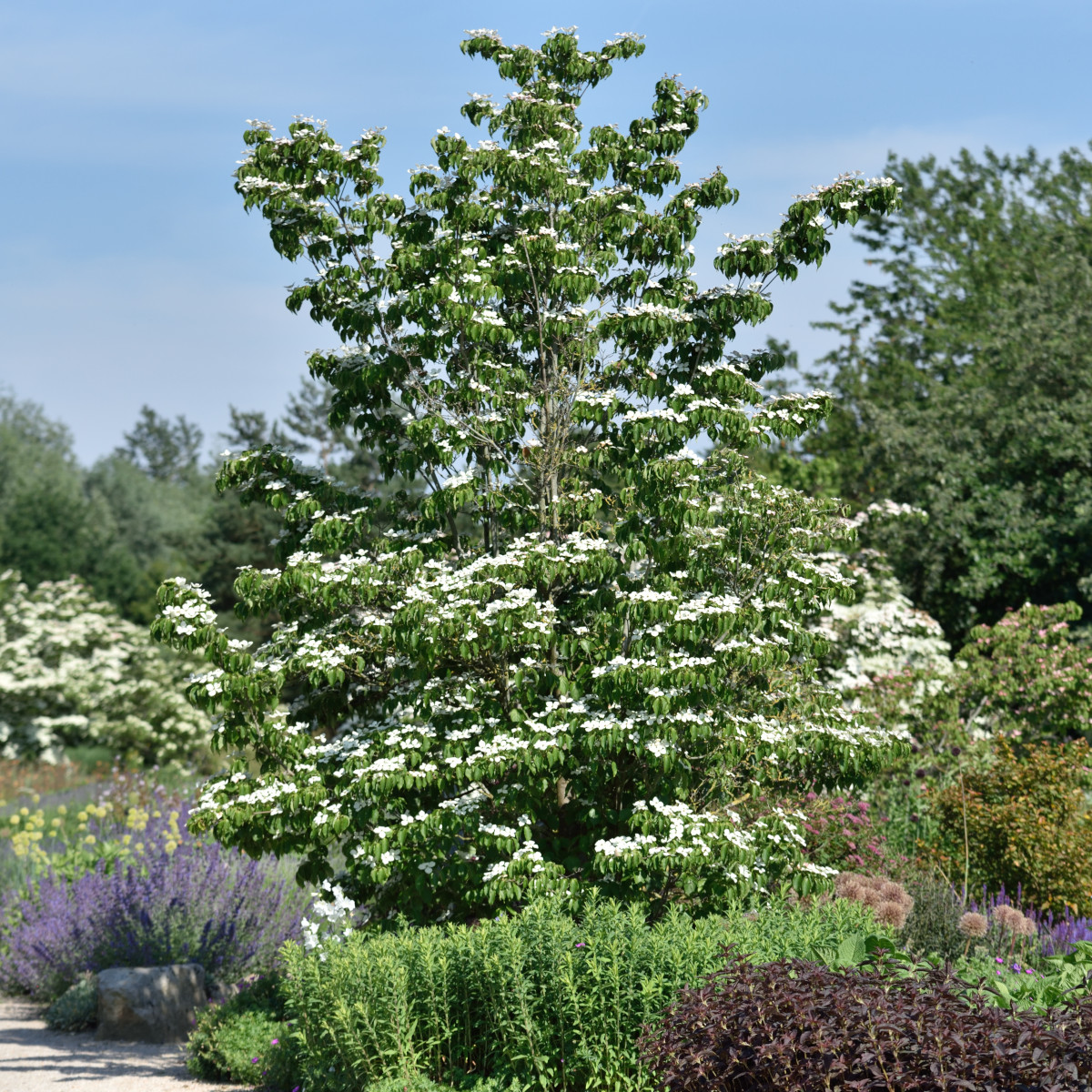 På hösten övergår de mörkgröna bladen i en intensiva röda nyanser, vilket bidrar till ett sprakande höstlandskap. Samtidigt utvecklas röda bär som liknar små jordgubbar och blir ett dekorativt inslag samtidigt som de lockar fåglar. Cornus kousa 'Weisse Fontäne' trivs bäst i väldränerad, näringsrik jord och föredrar en placering i sol till halvskugga. Den är lättskött och kräver minimal beskärning men kan formklippas vid behov under vårvintern eller efter blomningen. Med sitt vackra hängande växtsätt, intensiva höstfärger och dekorativa bär är 'Weisse Fontäne' ett utmärkt val för att tillföra elegans och liv till trädgården.