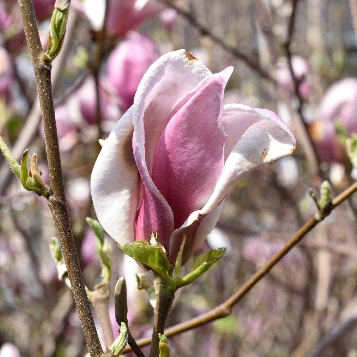 Effektfull blomning på bar kvist med ljusrosa blommor med purpurrosa utsida.