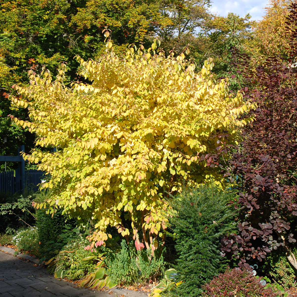 Bladverket är friskt grönt med ovala blad som skiftar till vackra nyanser av gult och orange under hösten innan de faller. Det som verkligen gör 'Winter Beauty' unik är dess fantastiskt färgstarka grenar som under vintern skiftar i nyanser av orange, gult och rött, vilket ger ett livfullt och upplyftande inslag i trädgården under de mörkare månaderna. Barken är slät och accentuerar de starka färgerna som framträder tydligt när busken är lövlös.