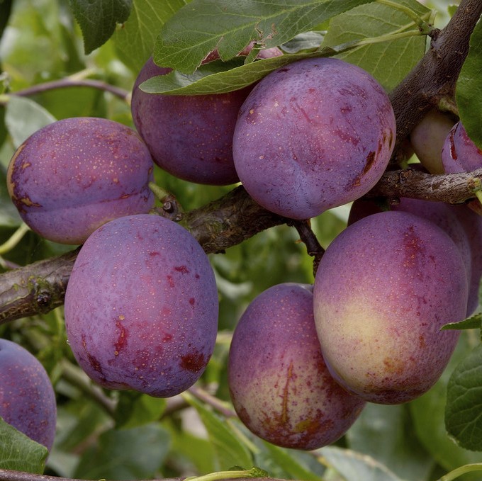 stor, rödlila, fast saftigt gult fruktkött, sötsyrlig smak, mognar sept, bordsfrukt, grönt kulturarv, sol, zon 1-4, självfertil.